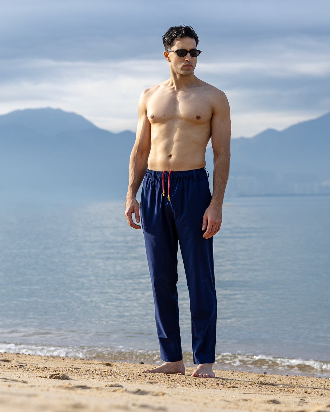 Designed for an adjustable fit, they feature an internal drawstring with an elastic waist and belt loops, ensuring comfort whether you're on the golf course, at the beach club, or lounging by the pool. With a smart and chic straight cut that flatters all body types, these trousers seamlessly transition from day to night, making them an essential part of your holiday wardrobe. Versatile in use, HapaTrousers are perfect for swinging a club, enjoying a beach barbecue, or simply relaxing by the pool.